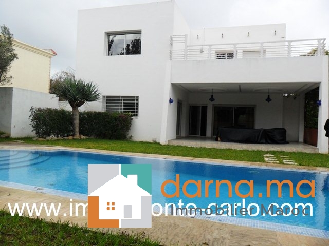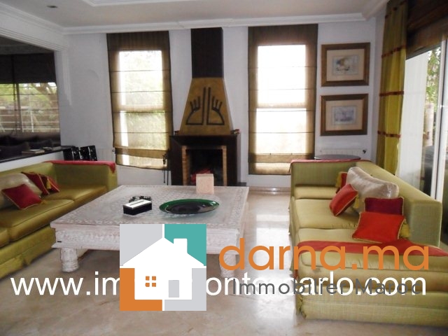 À louer villa bien meublée à Rabat Hay Riad.Dans un environnement privilégié,  belle villa bénéficiant de prestations luxueuses, avec piscine, chauffage central, climatisation réversibles dans toutes les pièces,Situé sur une rue tranquille en plein cœur d’un quartier branché et résidentiel : grandes surfaces, restos, cafés, boutiques, épiceries, services, agences de voyage, pharmacies, salles de sport, musique et danse, rues piétonnes bordée de terrasses, où l'on apprécie se promener avec les enfants dans la journée ou les soirs d'été. Villa construite sur 3 niveaux avec un beau jardin avec mobilier de terrasse et grand  garage, comprenant double salons avec un coin cheminée, une terrasse couverte offrant une superbe vue sur la piscine et le jardin ,un séjour lumineux, une salle à manger, salle d’eau des invités,  une suite parentale avec dressing et salle de bain avec jacuzzi, grande terrasse  3chambres à coucher chacune avec sa salle de bain et balcons, une cuisine bien équipée (réfrigérateur, congélateur, plaques vitro, four, ..), internet haute vitesse, ameublement, literie, lave-vaisselle, laveuse-sécheuse…… buanderie,  logement de personnel, débarras, à louer pour longue durée,Pour plus d’informations ou visite n’hésitez pas de contacter notre agence immobilière Immo Monte-Carlo au N° de tél: +212661464037/ +212661212547ou Tél/Fax: +212537755043 ou par E-mail : Cette adresse e-mail est protégée contre les robots spammeurs. Vous devez activer le JavaScript pour la visualiser. ou visitez notre site www.immomonte-carlo.com ou  rendez-vous au 15. Av, Al Abtal N°4,  Agdal Rabat.
