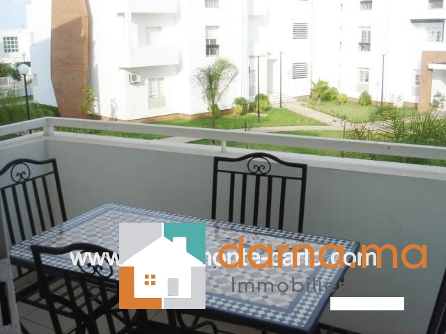 Location appartement meublé avec terrasse à Rabat à Bassatine Al Manzeh, 2Façades (Un balcon par façade) chauffage et climatisation dans toutes les pièces, sans vis-à-vis, immeuble avec ascenseur dans une résidence fermée avec jardin, sécurisée 24/24, dans un endroit calme et proche de toutes commodités, composé de 2 salons avec cheminée, séjour, salle des invités, terrasse, suite parentale avec dressing, salle de bain et balcon, deux chambres avec salle de bain et balcon, une cuisine équipée, buanderie, débarras, garage.